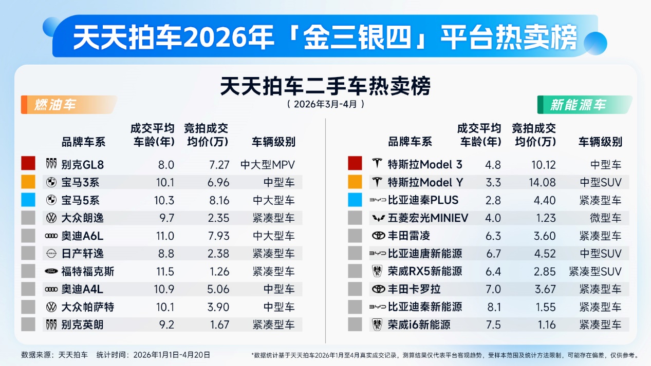 本报讯 (记者刘钊)3月随着春节假期结束,二手车商全面复工,二手车平台交易也步入正轨,消费需求持续释放,市场进入稳步复苏期,加速回暖。近日,国内领先的二手车交易在线服务平台——天天拍车发布了2026年“金三银四”平台热卖榜,以大量真实成交的数据为基础,给出了2026年3月至4月二手车交易通过全国在线竞拍模式高效卖车激发市场升温的信号。榜单揭示了当前经济实用型的代步车型正成为卖车行情中的成交主力,车主也更有机会提高卖车收益。