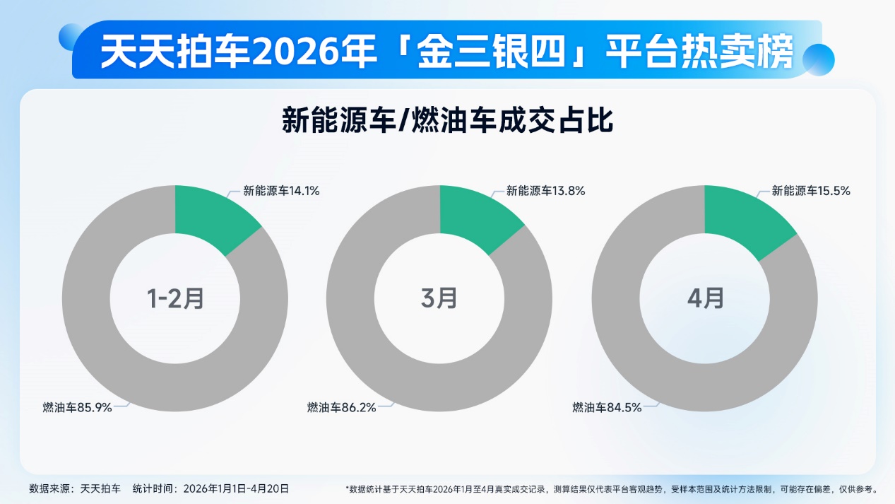 此外,进入3月以来,受到国内外多重因素叠加影响,新能源汽车在智驾体验和用能成本方面的优势凸显,新能源汽车新车销量强劲,推高保有量,带动新能源二手车交易升温。平台数据显示,2026年4月平台新能源二手车成交占比达15.5%,比3月提高1.7个百分点。