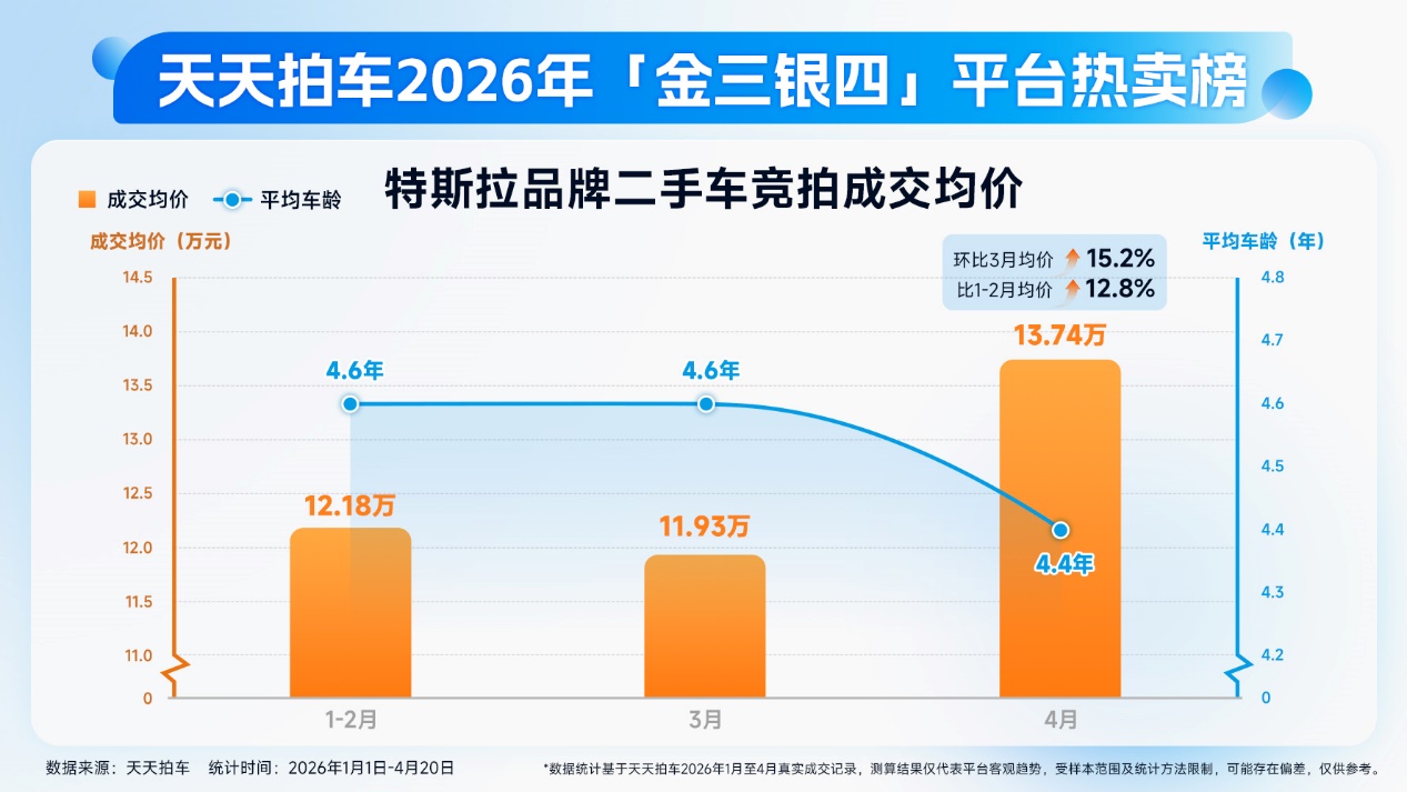 新能源二手车交易旺,热门新能源车的成交价格也有一定上涨。榜单数据显示,长期“霸榜”热卖新能源品牌榜单——特斯拉4月二手车竞拍成交均价为13.74万元,比3月以及1-2月分别增长15.2%和12.8%,车主收益空间明显扩大。总体来看,个人车主完全不必担心10万元以内价位的旧车失去交易潜力,天天拍车的真实成交数据显示,此类车源反而能凭借使用成本低、广适配场景的特点,获得稳定的价格支撑,通过竞拍直连买家的方式释放更多溢价空间,也更容易成为现实收益。