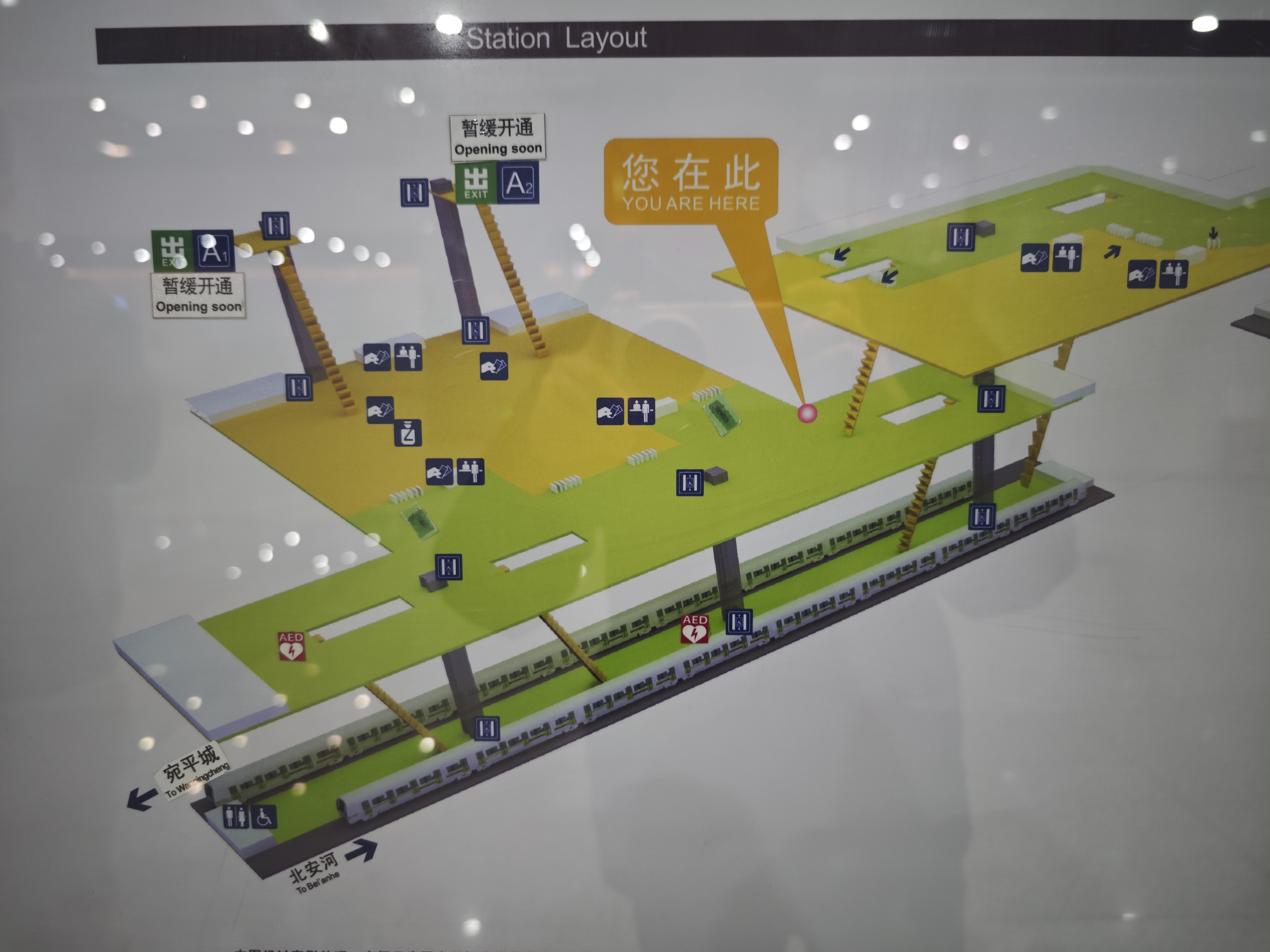 按照原本的设计,乘客到达B2层的站厅之后,A1、A2口的外挂厅就在旁边,就近通过闸机之后,再乘坐扶梯或者直梯就可以出站,进入北京丰台站的范围。然而由于A1、A2口封闭,外挂厅所在的通道无法通行,乘客只能继续向前,再乘坐扶梯或者直梯前往B1层地铁10号线的出站口出站。如此一来,乘客需要绕上一段路,多花几分钟的时间。