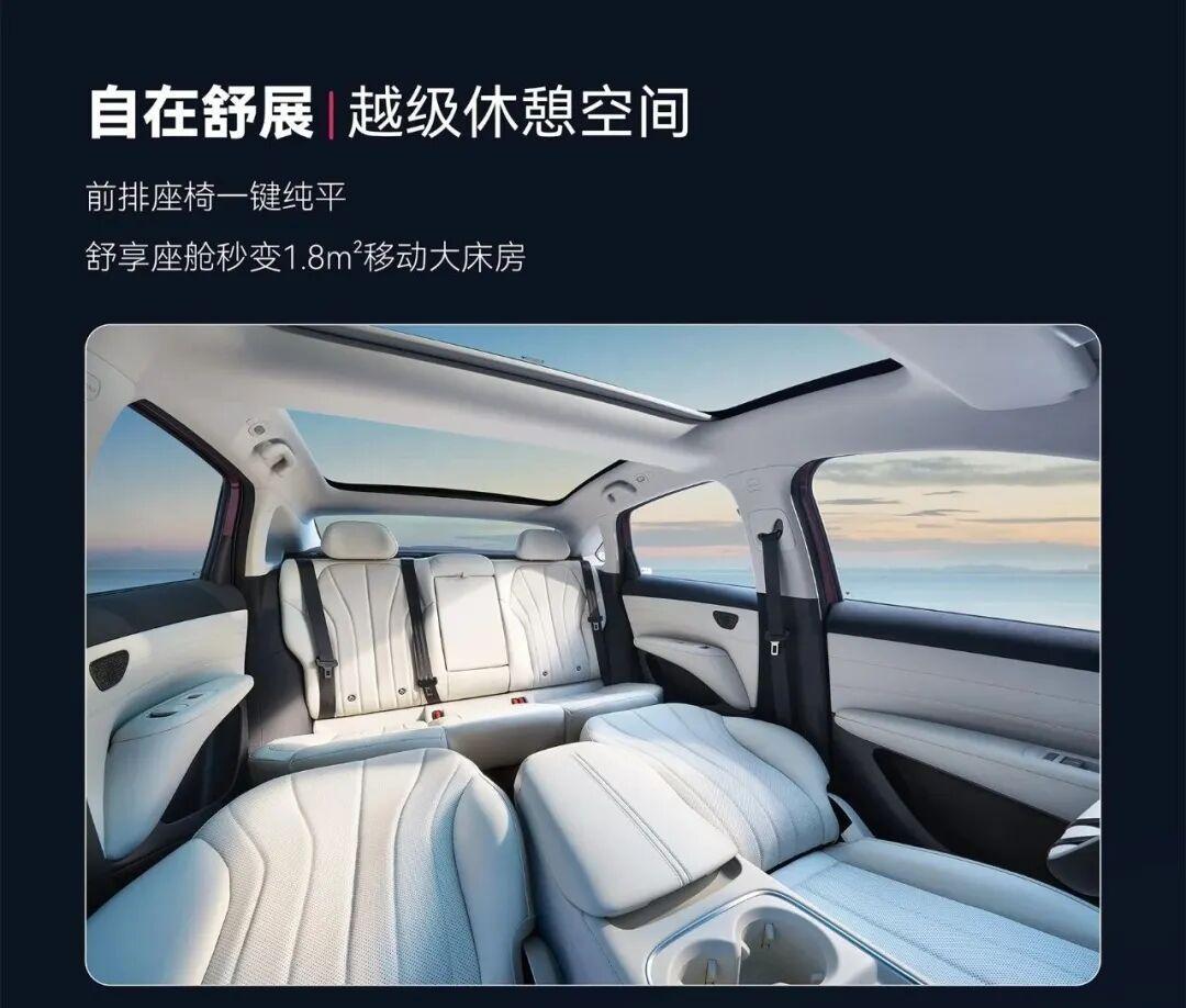 前排座椅支持一键纯平功能,放倒后可与后排连接,形成1.8㎡的“移动大床房”,非常适合家庭出游时的午休或小憩。在长途旅行中,乘客可以在车内舒适地休息,缓解旅途疲劳。此外,虽然采用全景天幕,但保留了物理遮阳帘,这一细节充分考虑了夏季用车的实际痛点,为乘客提供了更加贴心的呵护。