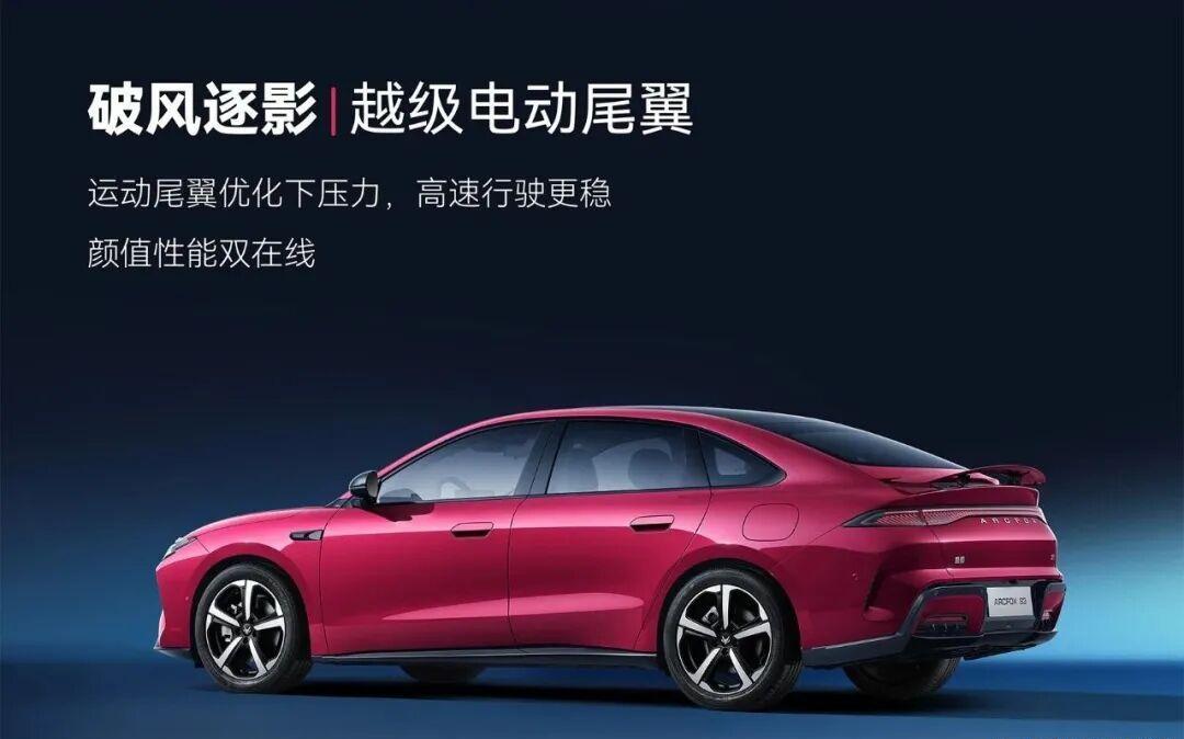 车身姿态方面,侧面线条流畅,线条向后延伸,搭配1.94黄金轴高比,营造出强烈的运动姿态。半隐藏式车门把手不仅美观,还能有效降低风阻,提升车辆的行驶效率。值得一提的是,新车配备的“破风逐影”电动尾翼,可有效优化下压力,预计将带来极佳的风阻系数,进一步降低能耗、提升续航表现,让车辆在行驶中如破风之箭,轻盈而高效。