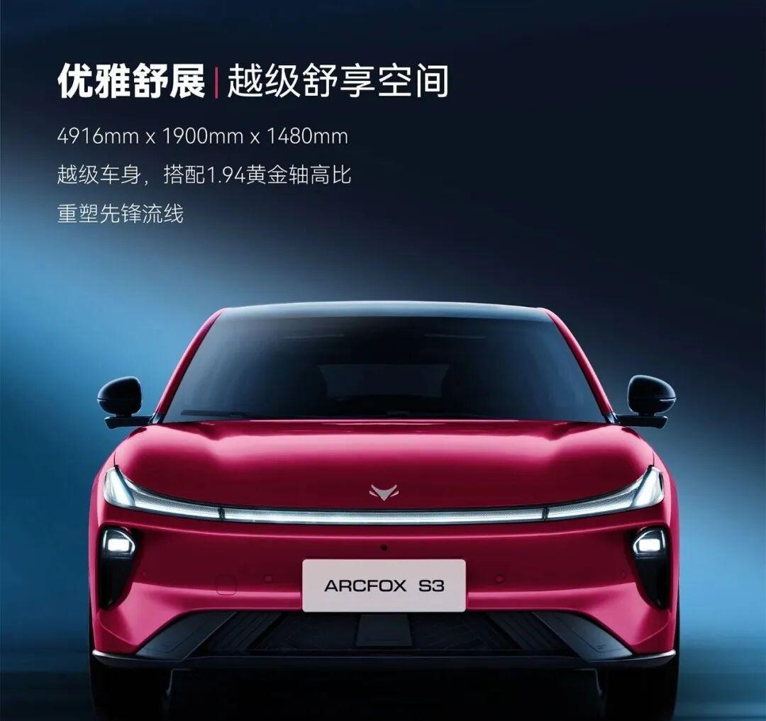 极狐S3的车身尺寸为4916mm×1900mm×1480mm,轴距达到2876mm。与同级主要车型相比,极狐S3在车长、车宽及轴距上均具备显著越级优势。尤其是1900mm的超宽车身与2876mm的长轴距,为家庭用户的日常通勤及长途出行提供了宽裕的乘坐空间。