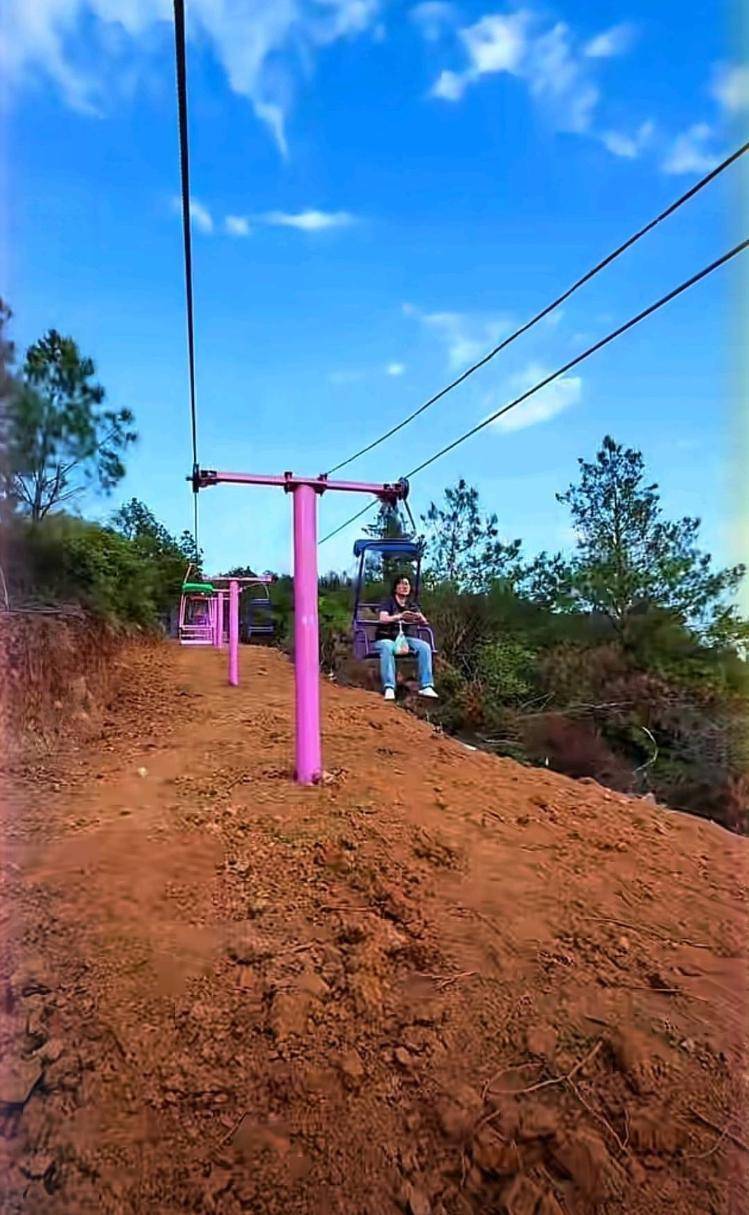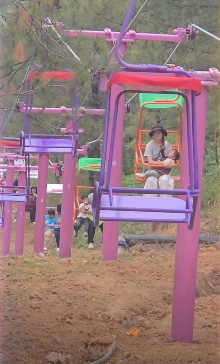 拍摄者称,视频中的缆车当天是免费坐的,缆车的周边还有美化。刚开始还是挺高的,快到山顶时离地面很低,速度也很慢,而且前面的游客可以用脚踩在地面上。